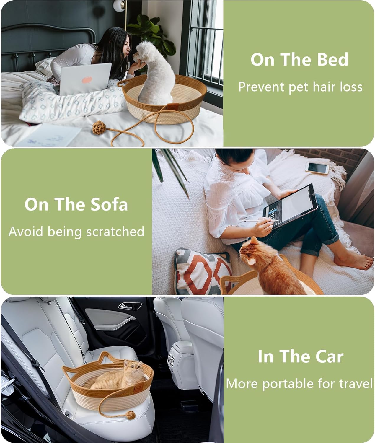 Hand-Woven Cat Bed with Toy Tail – Natural Cotton & Linen Kitten House with Scratch Pad.